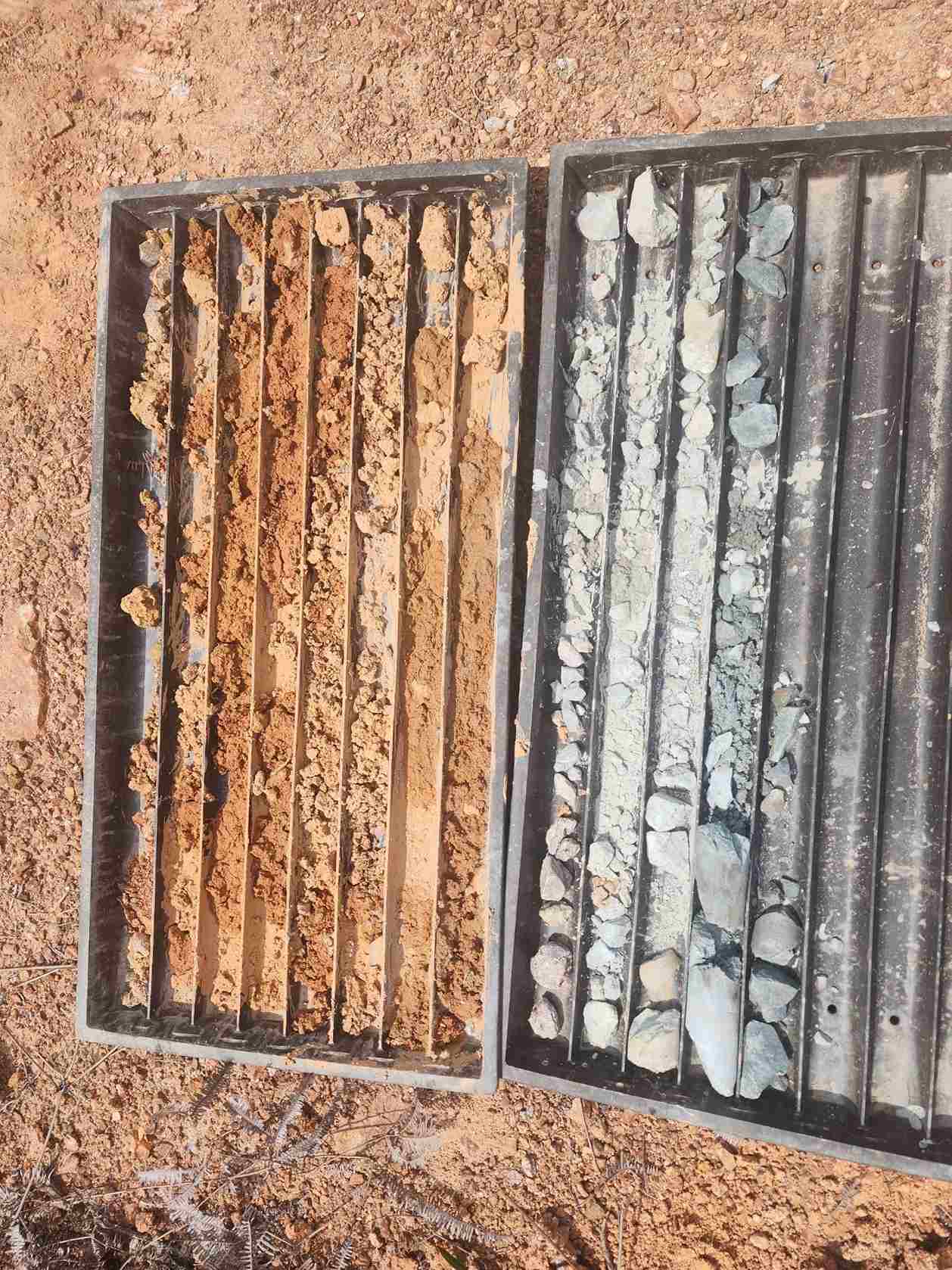 We excavate shallow trenches across anomalies to expose bedrock for structural mapping and sample collection.